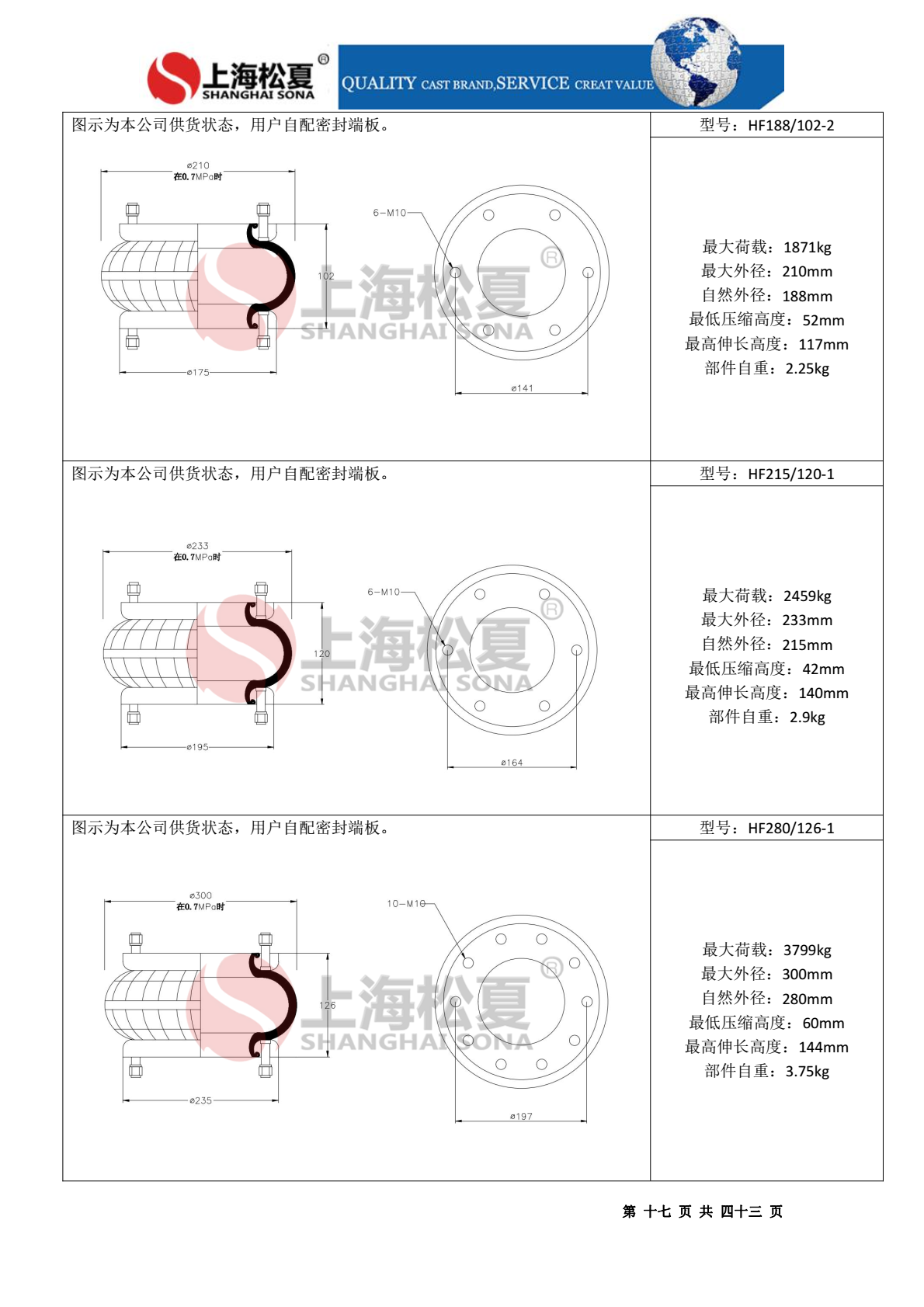 根據(jù)聯(lián)接方式可以分為三大類:一類為固定式法蘭聯(lián)接型,空氣彈簧的兩端邊緣尺寸和曲囊.大外徑相等或略小一些,鉆若干個孔后用法蘭環(huán)和端板緊固聯(lián)接;另一類為活套式法蘭聯(lián)接型,空氣彈簧的兩端邊緣尺寸比曲囊.大外徑小得多,無須鉆孔,用一個.制的法蘭環(huán)和一個普通端板緊固聯(lián)接;.三類為自密封型,不用法蘭聯(lián)接,壓入端板,充入壓縮空氣則自行密封。